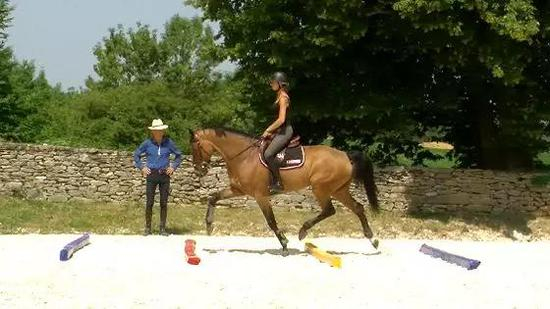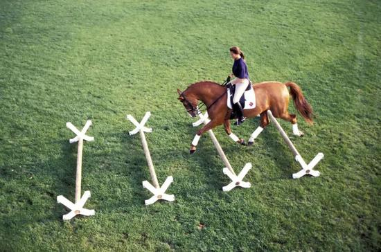 练习伸长跑步时同理,先让马匹适应跑步过地杆的节奏,再慢慢扩宽地杆距离。