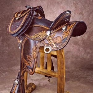 适用于展示赛的专用鞍具。展示赛是展示各牧场繁育马匹的精良体格外形与优美的运动步伐,以“比美”为主要目的,运动幅度平和。因此,展示鞍以精雕细琢的刻花和绚烂夺目的银饰为首要特点,整体线条结构宽大厚实,是各类西部鞍中最重的一种。