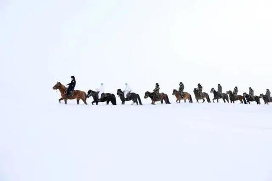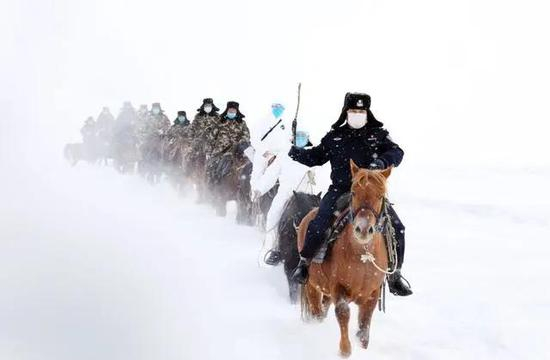 照片中的马背战士们,是新疆阿勒泰地区富蕴县库尔特边境派出所的民警和护边员。此行,他们要前往离县城最远的边境村——塔本别勒切尔村,工作是边境踏查、防疫走访和疾病诊疗。