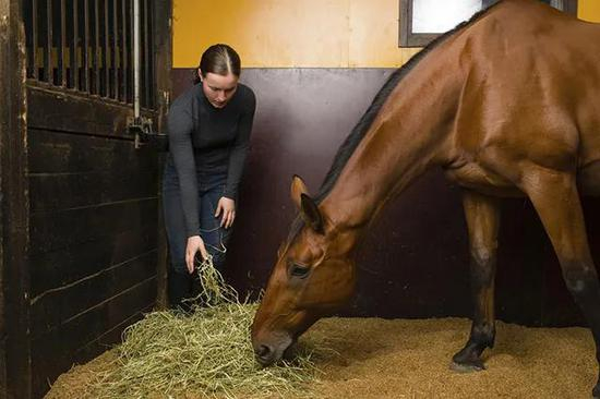 喂马匹的草料必须放置在地上。在世界上很多地方,有人会把草高高地放在墙上的一个饲料架里面,这种放置会在马匹进食的时候对马匹颈部产生压力。这里还有一个原因,那就是在自然状态下,马匹都是低头吃草的。