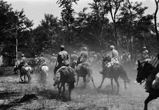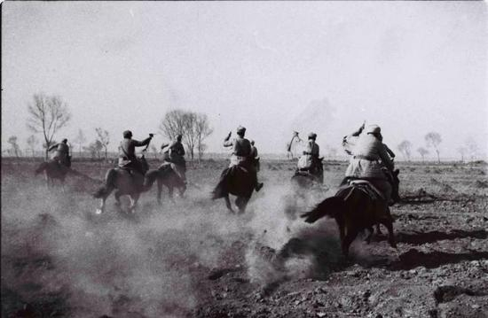 ◆1941年5月1日,冀中军区在安平县义里村举行三纵队成立3周年纪念活动,冀中骑兵团做马术表演。
