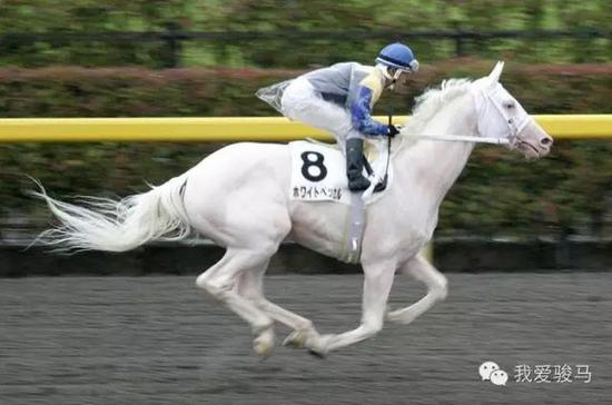 一匹在日本比赛的白色纯血马,有白化症特征(全身,特别是眼睛缺乏黑色素),可和上面波兰白色纯血马比较。