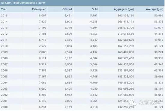 2000年至2015年拍卖情况,从表中可以看出,2015年,有6461匹马参加拍卖,共成交5101匹,成交金额共262139150坚尼(Guinea),平均每匹马成交额50499坚尼,约53023英镑(约519100人民币)。