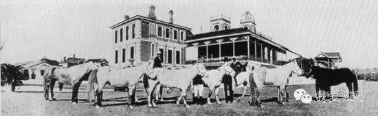 上海跑马厅马厩外景(1908年),从马匹形态看,纯血马的可能性很大。