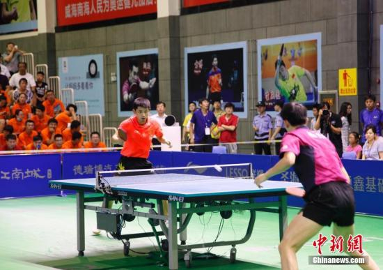 7月14日,中国男子乒乓球队在山东威海南海新区举行热身赛,检验前期封闭训练的战术成果以及运动员的心理状态,通过设置与奥运会相似的比赛环境和赛程,让运动员达到最好的比赛状态。刘昌勇 摄