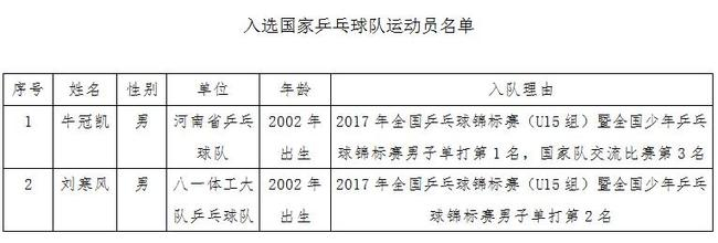 根据《国家队运动员、教练员选拔与监督工作管理规定(试行)》和《国家乒乓球队运动员选拔办法实施细则》的要求,本着公平、公正、公开的原则,现拟选拔两位运动员入选国家队,现将公示有关事宜通知如下:
