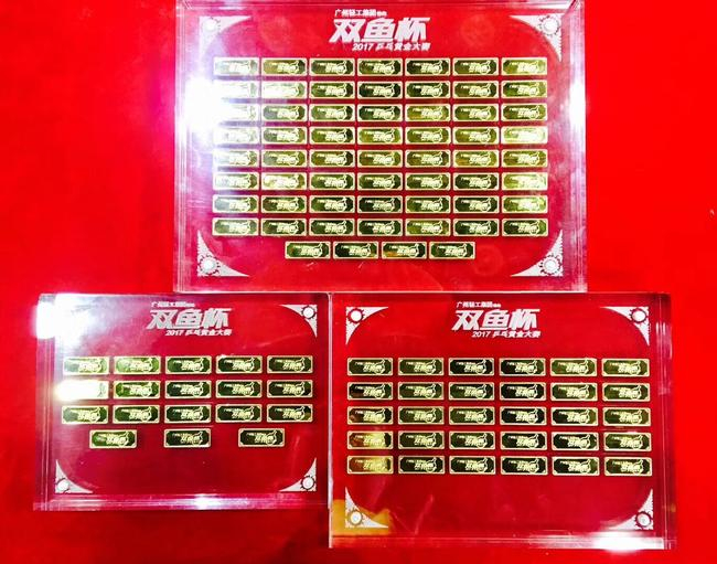 为期4个月的广州轻工集团特约2017“双鱼杯”乒乓黄金大赛,于12月3日在广州海珠区全民健身中心举行总决赛。12个赛区的冠军队伍为总值18万元的足金金条而战,代表北京赛区的中山坦洲乒协队夺得总冠军,独得总值10万元的足金金条,代表河北赛区的嘉和地产队和来自四川赛区的兴城俱乐部队分获亚军与季军,两队瓜分了总值8万元的足金金条。2004年雅典奥运男双冠军陈玘亲临现场为选手们加油助威,他在总冠军对决前与民间高手切磋球技,并担任决赛解说嘉宾。