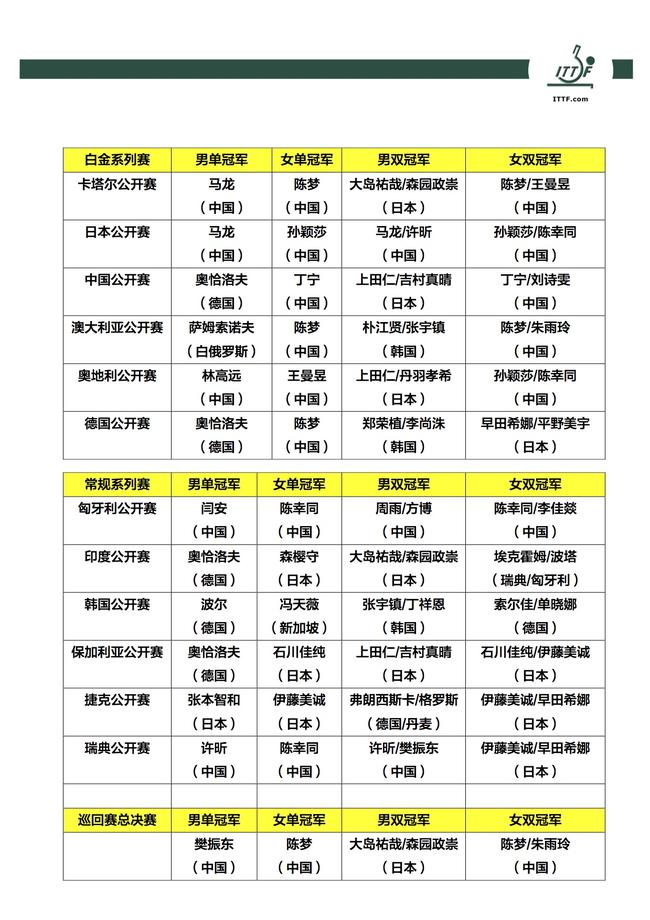 2017赛季随着国际乒联总决赛顺利收官的同时,也画上了圆满的句号。12站世界巡回赛和年终总决赛、男女世界杯、世界锦标赛,在精彩纷呈的2017年中,来自世界各地的乒乓好手究竟突破了多少难关、打出了多少出彩的成绩?国际乒联用一张表格,简单为您回顾盘点2017年各大比赛的战绩。