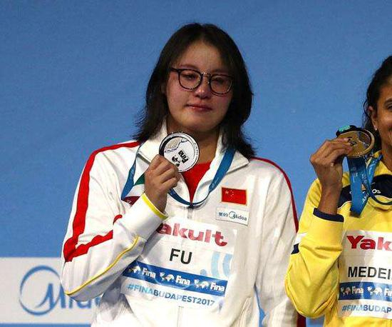 游泳世锦赛,流泪的傅园慧展示银牌。