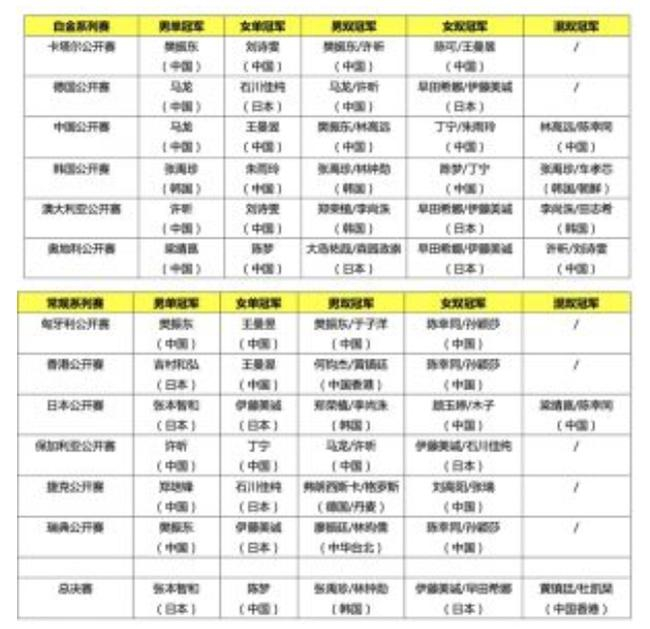 细数12站巡回赛和总决赛的战绩,不难发现亚洲力量继续主宰国际乒坛,各项目冠军几乎被中国、日本、韩国三个协会瓜分。共58个冠军中,中国队豪取34冠,日本队手握13冠,韩国队拥有6项冠军,以及朝韩联队联手拿下的韩国公开赛混双冠军。中国香港队拥有2个冠军。中国台北队以及弗朗西斯卡/格罗斯组成的跨国组合则各有1个冠军入帐。