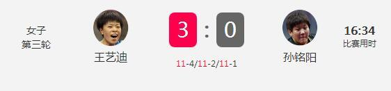 不过,在当晚倒数第二场结束的比赛中,第一阶段赛后还一起吃火锅的两位辽宁老乡——王艺迪和孙铭阳却是打出了当天用时最少的一场比赛——16分34秒,放眼世界,说起来这也不算是最快的,但在第一局已经用时超过9分钟的情况下,后两局总共只用时才7分钟,着实还是令人惊叹!当然,这跟她们的比分有关系,11-4/11-2和11-1,悬殊的比分令比赛耗时极具减少——要知道,首日比赛中总共只有两场比赛出现过11-1这样的悬殊分差。值得一提的是,首日耗时倒数第二短的比赛,也是由孙铭阳创造的——在0-3负于丁宁的比赛中,三局比赛共用时22分12秒。