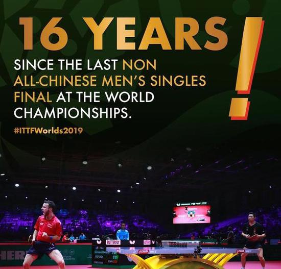 许昕失利,后国际乒联发了一张海报,主题是——男单决赛16年后将再现非中国选手。国际乒联撰文指出,许昕失利,使中国男单下半区失守,同时也意味着自2003年后,世乒赛的男单决赛将再次出现非中国籍选手的身影。在2003巴黎世乒赛男单决赛中,奥地利选手施拉格战胜韩国削球手朱世赫夺冠。而再往前追溯,上一次男单决赛中由一名中国选手对阵一名外协会选手的情况还是出现在1987年的第39届新德里世乒赛,当时中国选手江嘉良战胜了瑞典名将瓦尔德内尔。