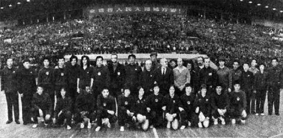 中、美乒乓球运动员友谊比赛结束后,丁西林和有关方面负责人陪同斯廷霍文团长走下主席台,和两国运动员合影。新华社记者摄(刊发于《人民日报》1971年4月14日第6版)