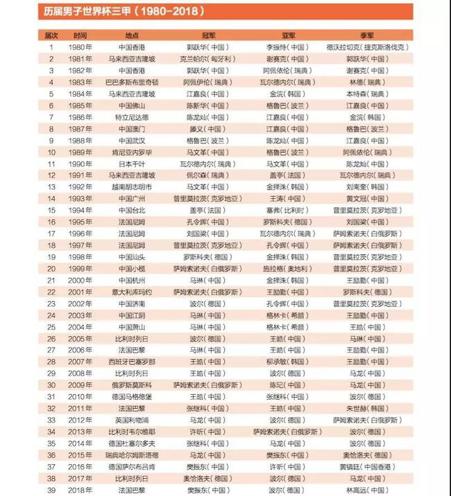 11月29日,2019男子世界杯将于成都举行,马龙和樊振东代表国乒出战。今年,男子世界杯将在成都迎来自己的“40岁生日”。在第40届比赛开幕前夕,带领各位回顾一下这项已到“不惑之年”的赛事历史。。。