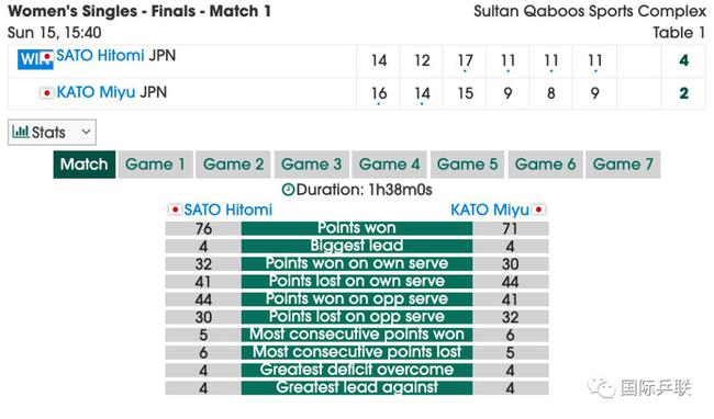 女单决赛在佐藤瞳和加藤美优之间进行。这场攻削鏖战堪称“旷日持久”。首局比赛,加藤美优以16-14获胜,先开局面。之后,仍然是加藤美优惊险胜出,她以14-12将领先优势扩大至2比0。第三局成为佐藤瞳扭转局面的转折点,比赛空前胶着,她以17-15顽强获胜,扳回一局。之后,佐藤瞳顺势连下3局,4比2逆转加藤美优夺冠。