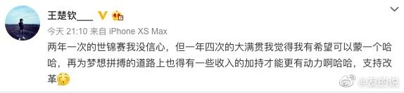 王楚钦发文:两年一次的世锦赛我没信心,但一年四次的大满贯我觉得我有希望可以蒙一个哈哈,再(应为“在”)为梦想拼搏的道路上也得有一些收入的加持才能更有动力啊哈哈,支持改革。