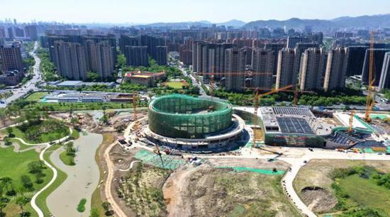 高处俯瞰,曲棍球场馆已初现雏形,三公里长的全民健身绿道也在铺设中。