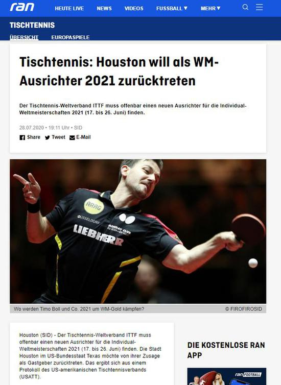 美国休斯顿放弃举办2021单项世乒赛 等待ITTF决定