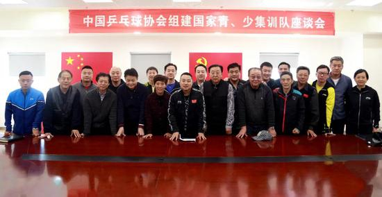 中国乒协召开组建国青(少)队座谈会,中国乒协主席刘国梁邀请许绍发、尹肖、陆元盛等功勋教练以及各省市代表针对组建国青、国少队共同座谈。