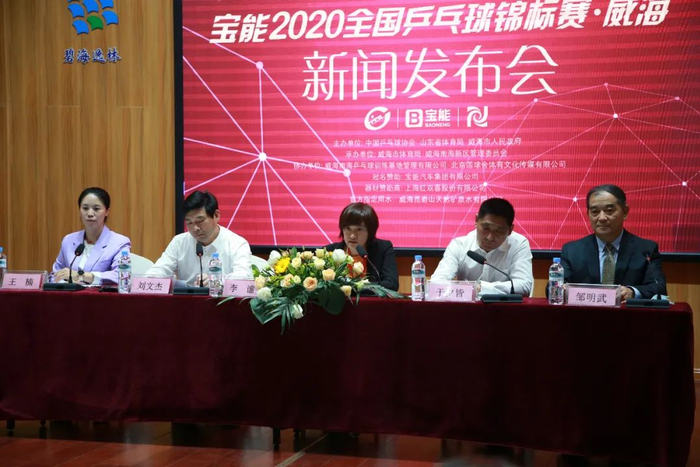 2020年9月30日14:00,宝能杯2020全国乒乓球锦标赛赛前发布会在碧海逸林度假酒店召开,威海市体育局副局长于夕皆、中国乒乓球协会业务部部长李谧、威海南海乒乓球培训基地管理有限公司董事长王楠等出席了此次发布会。