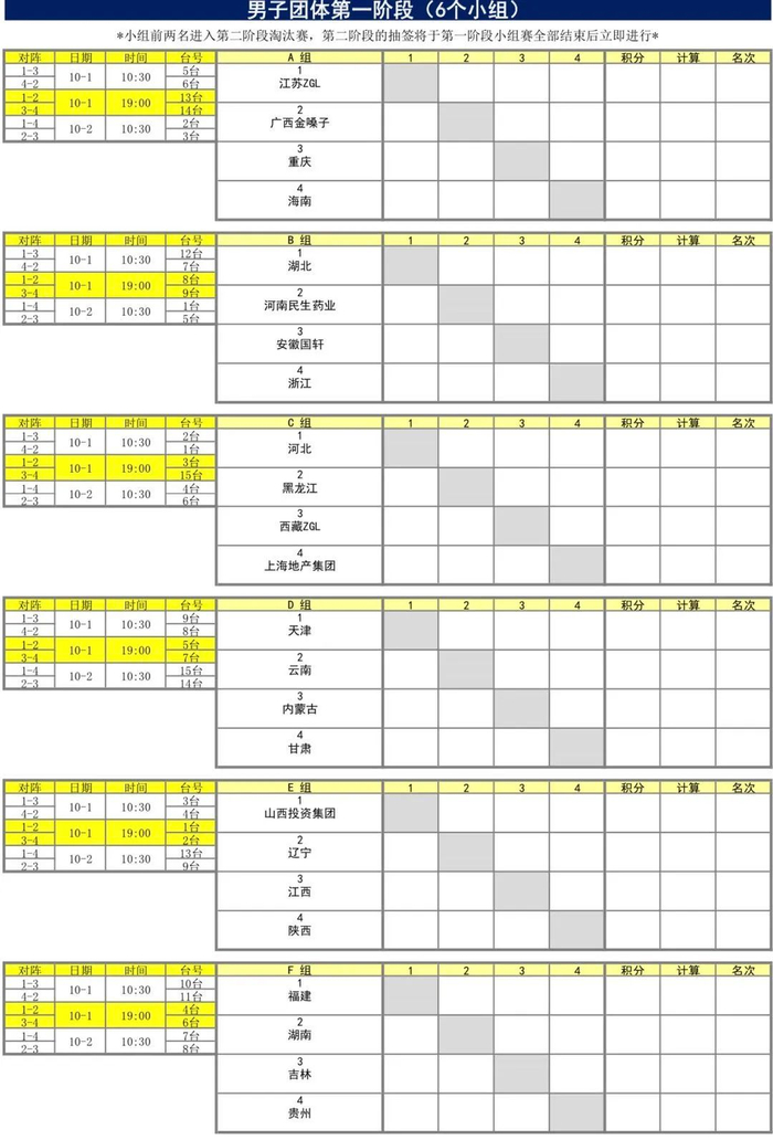 男团方面,北京、四川、广东和山东作为种子队伍直接晋级第二阶段淘汰赛,其余24支队伍分成6个小组,通过循环赛每个小组决出前两名晋级淘汰赛。