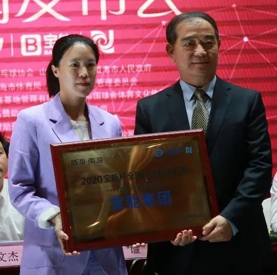 威海南海乒乓球培训基地管理有限公司董事长王楠,为赛事冠名赞助商宝能集团授牌。