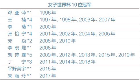 里约奥运会后,中国女乒的统治力再上一个台阶,但是在世界杯上的垄断却告一段落。2016年世界杯,丁宁和刘诗雯相继退赛,日本队16岁小将平野美宇趁势崛起夺得冠军,成为年龄最小的女子世界杯单打冠军,也是第一位非中国籍世界杯女单冠军。平野美宇的夺冠“催化”了日本女队的整体崛起,2017年亚锦赛,平野美宇连过丁宁、朱雨玲和陈梦三关夺得女单冠军,给中国女乒以重创。