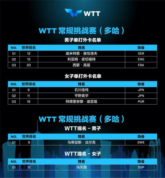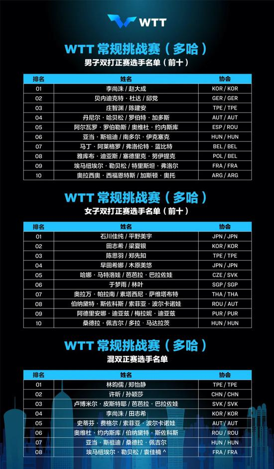 继1月19日公布中东赛事汇单打运动员名单之后,双打阵容及外卡和WTT提名名单也于昨日得到了确认。