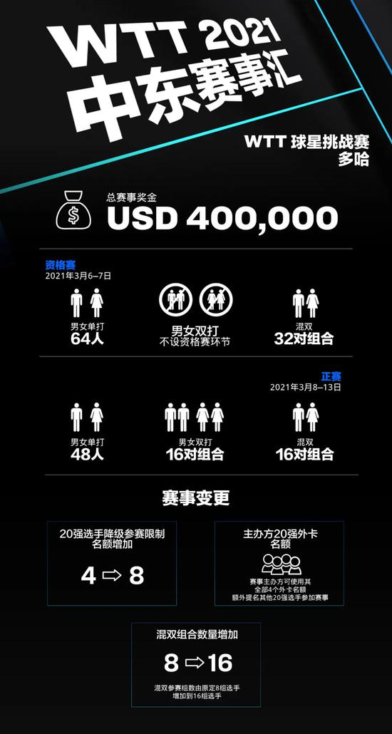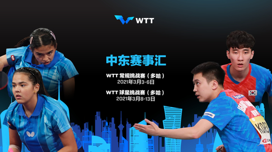世界乒乓球职业大联盟(WTT世界乒联)首届WTT中东赛事汇将于2021年3月3—13日在卡塔尔举行,多哈路萨尔体育馆将迎来两项赛事。