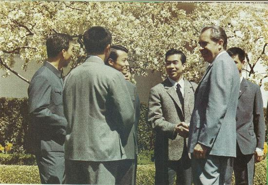 1972年,中国乒乓球队代表团访美,在白宫玫瑰园受到尼克松总统的接见。(左三为李富荣)
