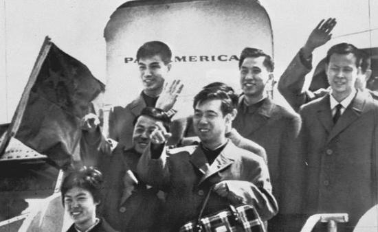1972年4月13日,中国乒乓球队代表团飞抵底特律,对美国进行回访。图为队员们正走出机舱,向欢迎的人群致意。(二排右一为张燮林)