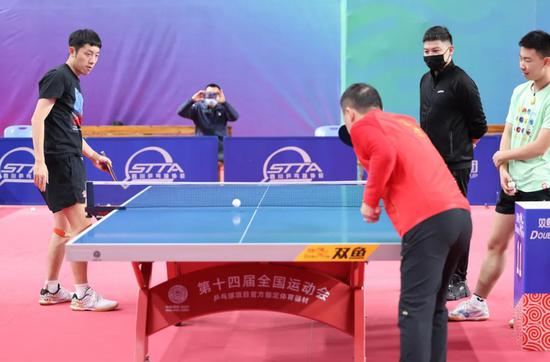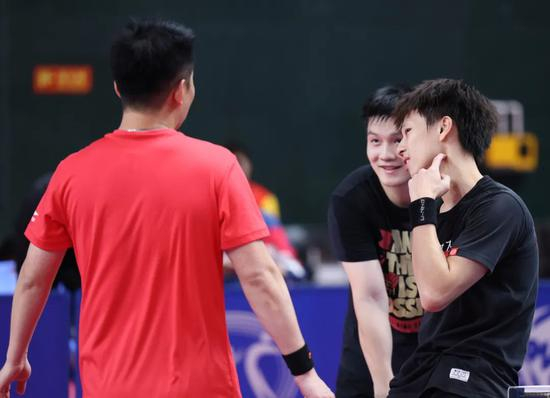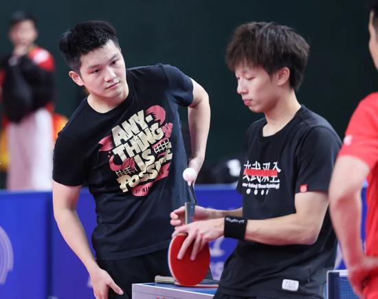 国乒两代直板选手,马琳和许昕在发球与接发球问题上进行了“业务讨论”。