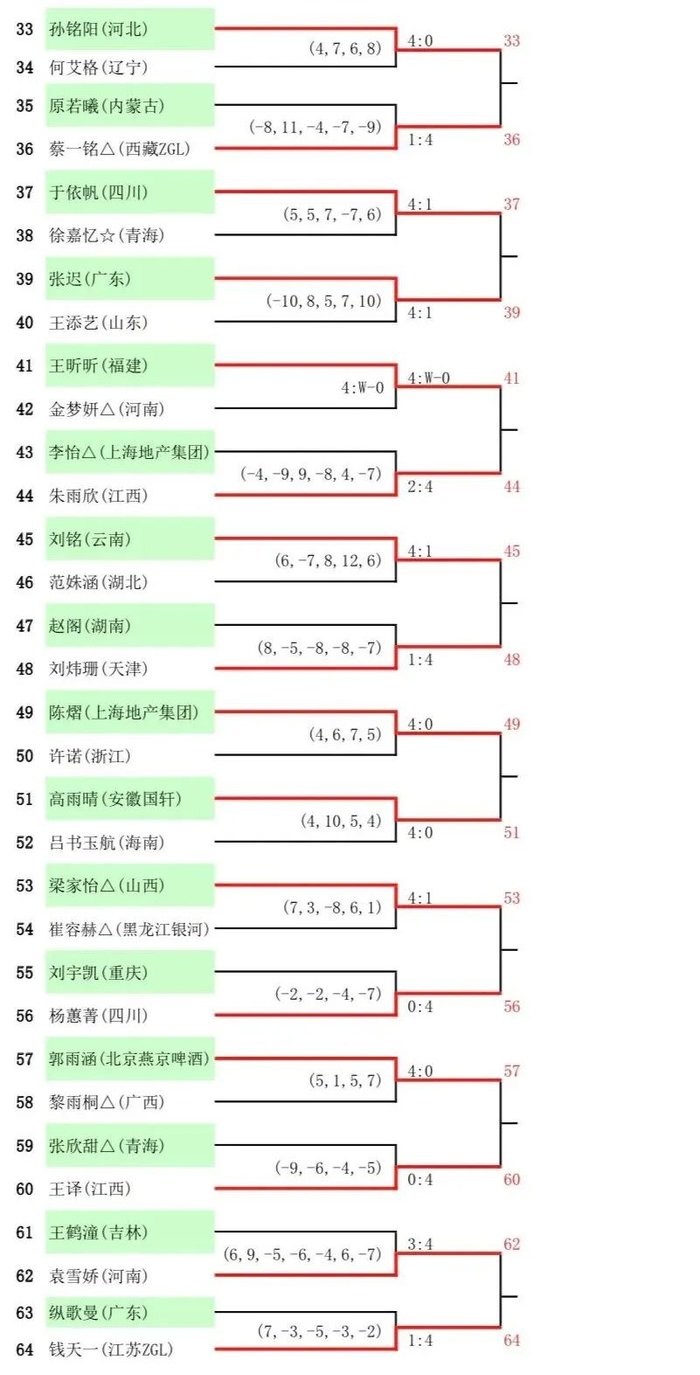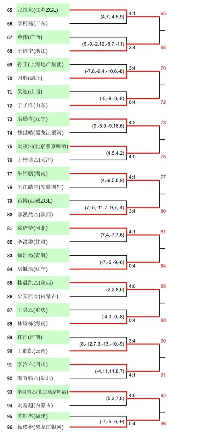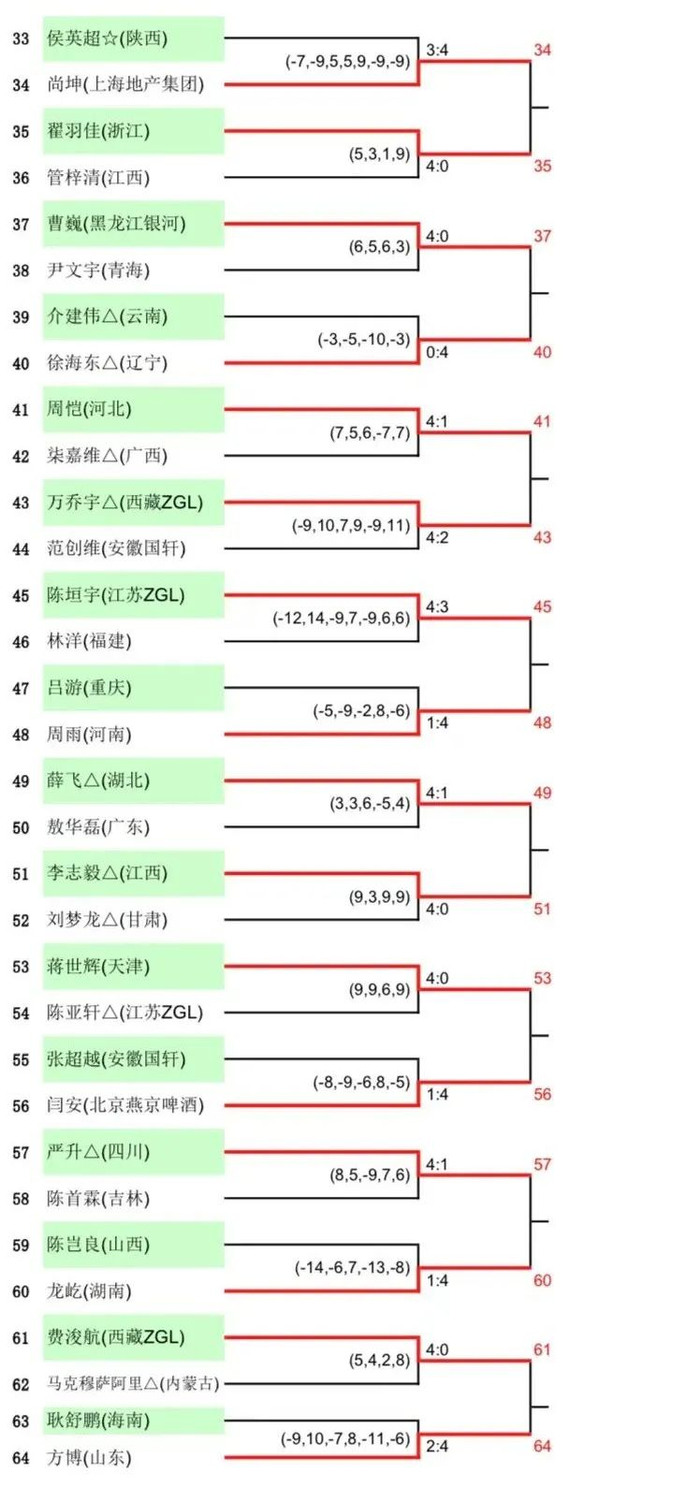 周启豪、郑培锋、周雨周恺、薛飞、闫安、张煜东、于子洋、刘丁硕等种子选手也都顺利晋级,任浩则在3比1领先的情况下被云南队员王麒凯逆转取胜,值得一提的是,王麒凯赢下的4局每局比分都只相差两分。
