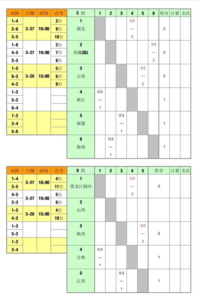其他方面,天津、辽宁、湖北等强队也都以3比0的比分轻松取得首胜,唯一出现的两场3比2出现在河南队和云南队身上,前者险胜重庆队,在重庆削球手廖容竹妍独取两分的情况下,袁雪娇、王畅、马菀含各得一分助队胜出。云南队则3比2击败福建队,和河南队情况类似,她们在对方头号主力李仁思佳拿到两盘胜利后,凭借更均衡的实力获胜。