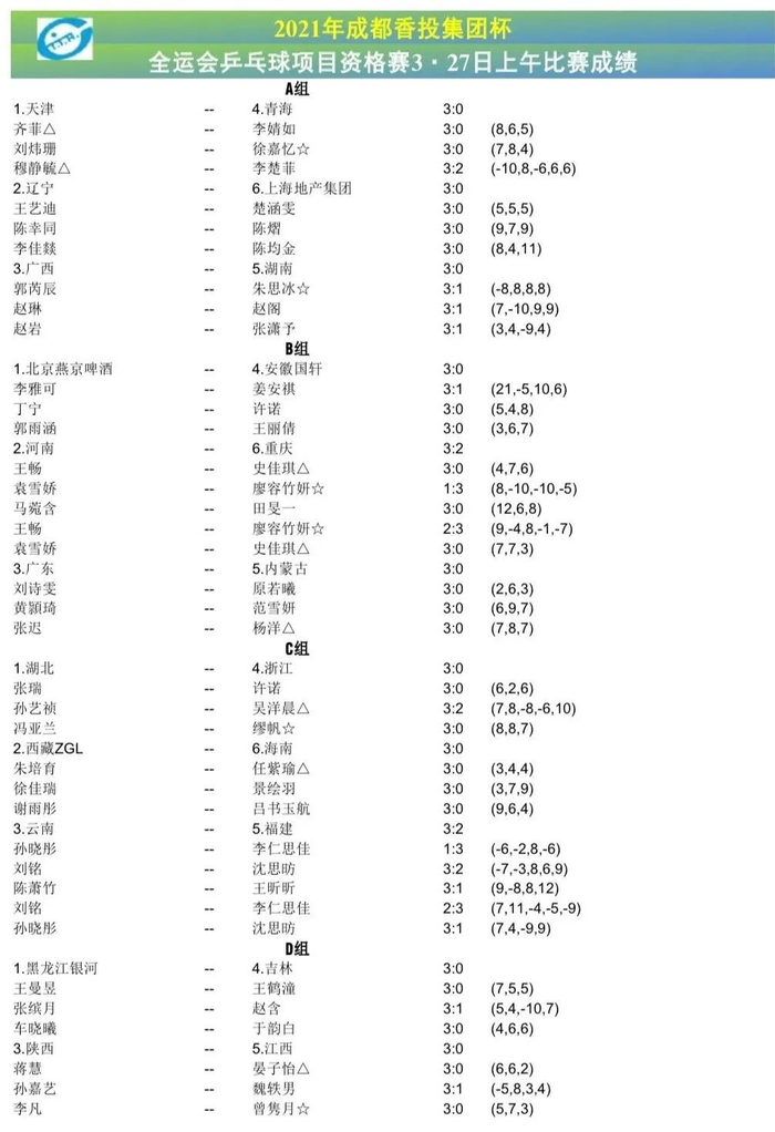 3月27日,2021年成都香投集团杯全运会乒乓球项目资格赛进入团体赛第一个比赛日,早上10点女团决赛拉开帷幕,全部11台同时开打。丁宁、刘诗雯和王曼昱分别带领北京、广东和黑龙江队赢得团体赛首场胜利。