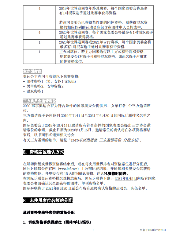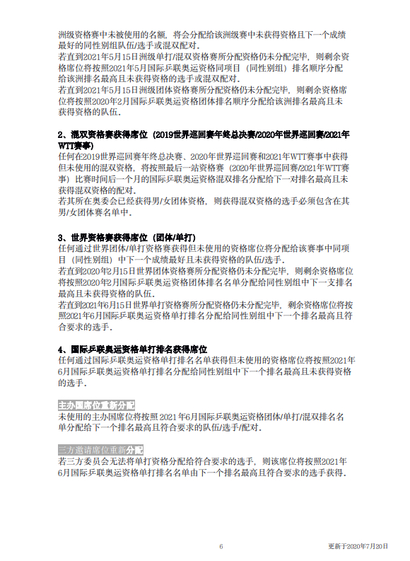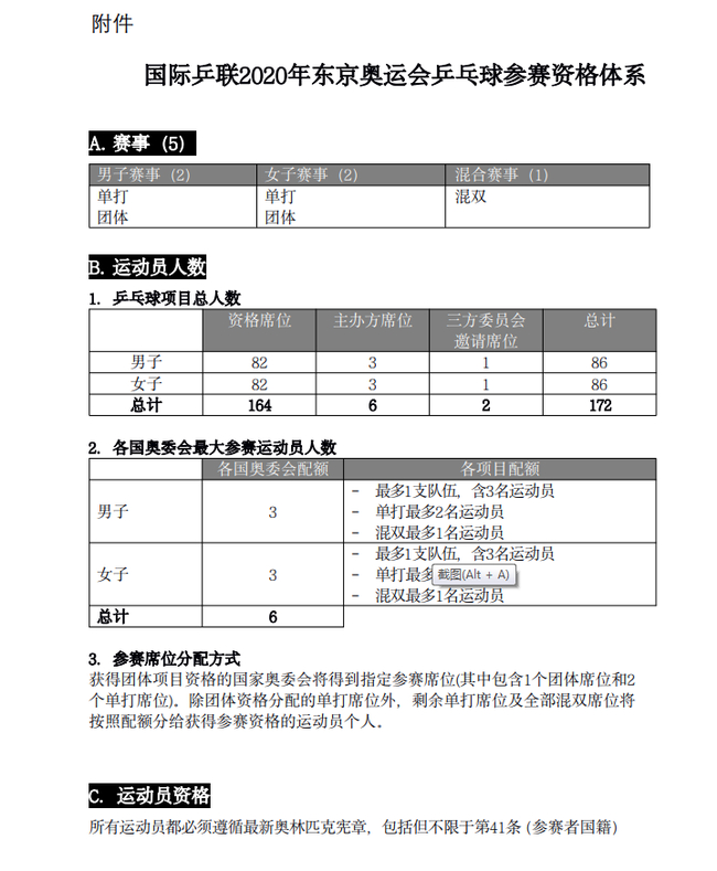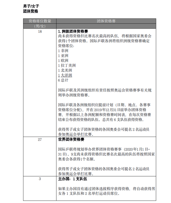 (一)按照国际乒联 2020 年东京奥运会乒乓球参赛资格体系规定,确定选拔的项目及名额。