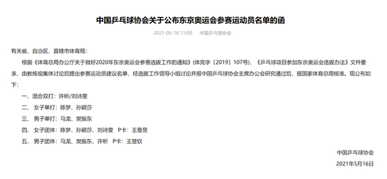 5月16日,据中国乒协官方公布信息显示,出征东京奥运会的中国乒乓球队员名单已经确定,详细内容如下: