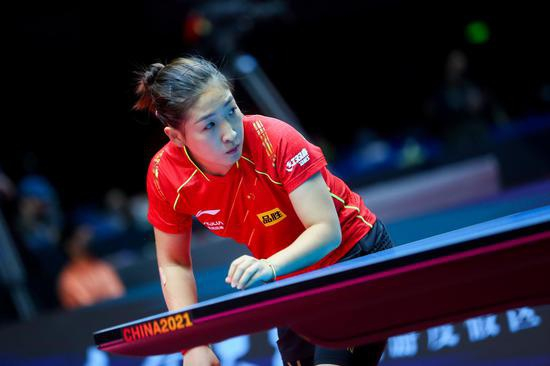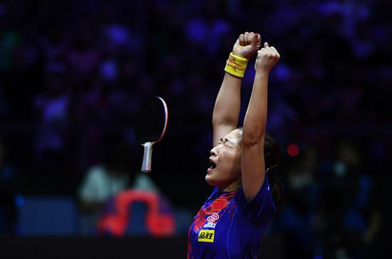 2021年,世乒赛女单比赛,刘诗雯庆祝夺冠。 新华社 图