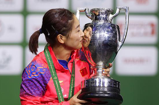 刘诗雯亲吻冠军奖杯。