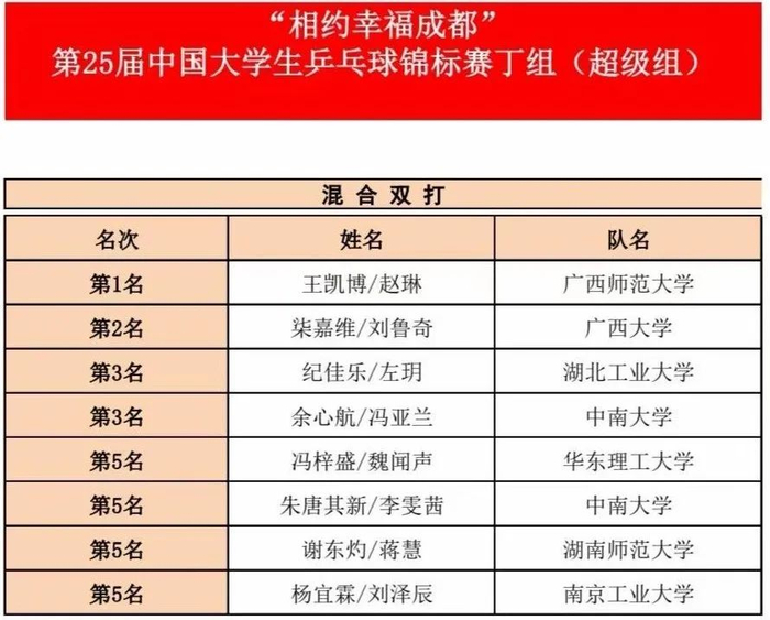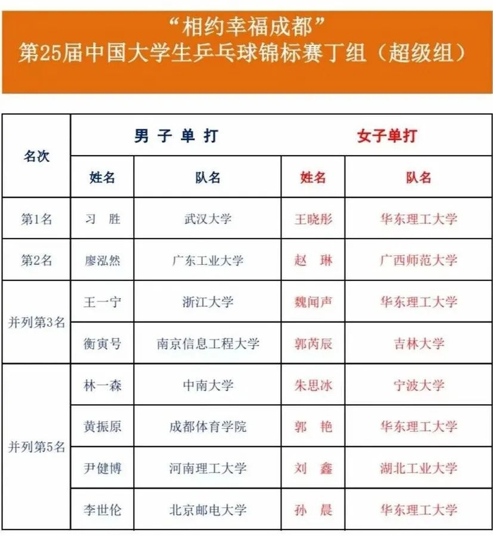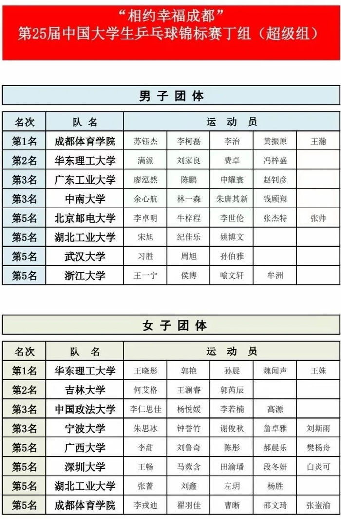 5月17日至21日,由中国大学生体育协会、成都大运会执委会主办,成都大运会高新赛区委员会承办,高新体育中心乒乓球场馆中心、成都市全国重点乒乓球运动学校执行举办的“相约幸福成都”第25届中国大学生乒乓球锦标赛丁组(超级组)在四川成都高新区体育中心体育馆顺利举行。