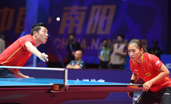 5月26日,许昕(左)/刘诗雯在比赛中。新华社记者张浩然摄