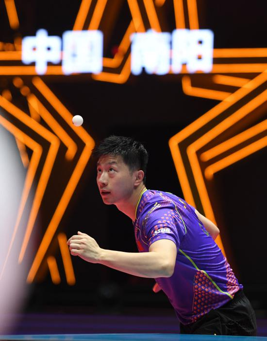 5月26日,马龙在比赛中发球。新华社记者张浩然摄