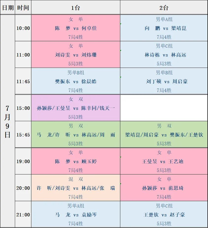 男单分3个组别进行循环赛,分别是A组:马龙、梁靖崑、袁励岑、向鹏;B组:樊振东、周启豪、徐晨皓、周雨;C组:王楚钦、林高远、赵子豪、林诗栋。其中,A组、B组采用7局4胜的循环,C组是5局3胜的循环。