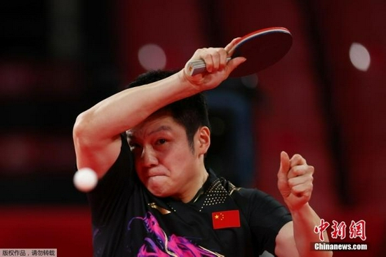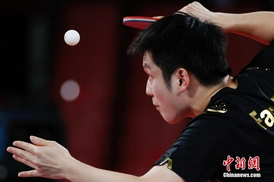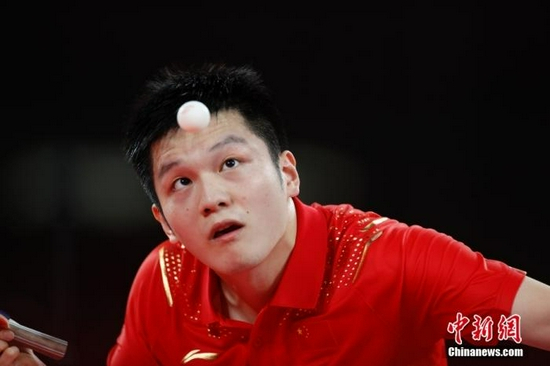 北京时间8月6日晚,在东京奥运会乒乓球男团决赛中,由马龙、樊振东和许昕组成的中国队以3:0战胜德国队,获得冠军。图为樊振东在比赛中。 中新社记者 韩海丹 摄