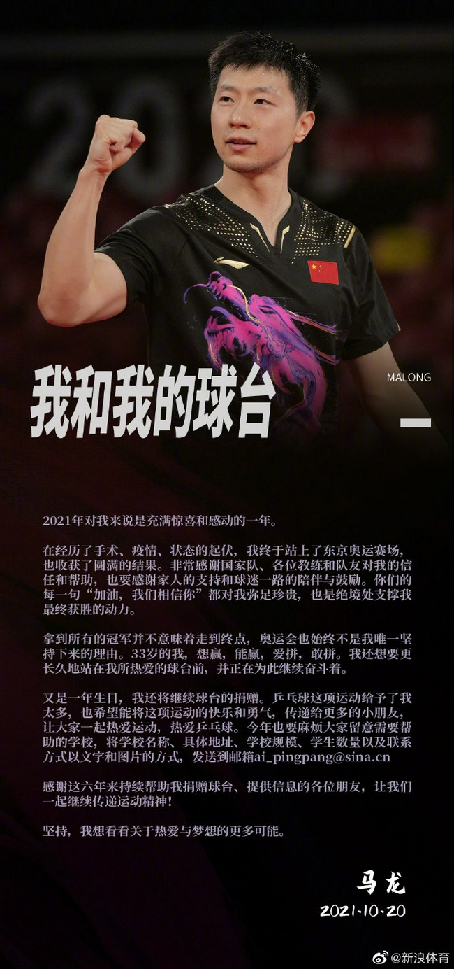 今天是马龙的33岁生日,在微博上,他回顾了自己的2021赛季:2021对我来说是充满惊喜和感动的一年