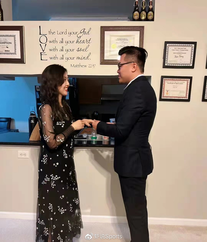 “都是打乒乓球的就比较聊得来,然后在一起了。最难的是因为疫情,我们人在两地,但最后还是坚持了下来。”经过近两年的异地恋,他们的爱情修成正果。1月5日,曾恂在美国求婚孙雪成功,第二天两人在结婚证书上认真写下自己的名字。