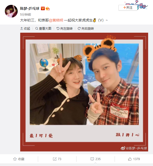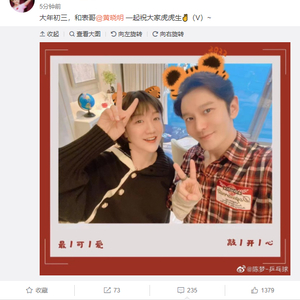 陈梦晒与黄晓明合照:和表哥一起祝大家虎虎生威