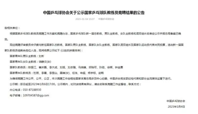 1月4日上午,中国乒协官网公布了国家乒乓球队教练员竞聘结果。此前,已公布国家乒乓球队总教练:李隼,国家乒乓球队男队主教练:王皓。