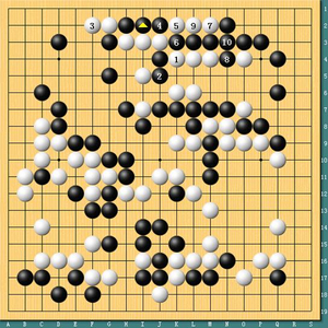 图一,唐韦星执黑VS李世石。中盘时候唐韦星通过一系列拼搏终于赢得攻杀上方白龙的机会。李世石如果直接1位顶,黑2位长,白3长后黑4爬过,这样李世石两边都差一手,对杀不利。