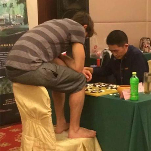其实关于这位棋手的图片不止一张,在连续几张图中显示,这位外国棋手先是跪坐在椅子上,过一会变成蹲坐,再过了才索性直接坐在椅背上。有观点认为业余比赛不必上纲上线,外国棋迷没有经过正规的围棋启蒙教育,不拘泥于礼节,重在享受围棋的快乐,因此对他们应当宽容一些。